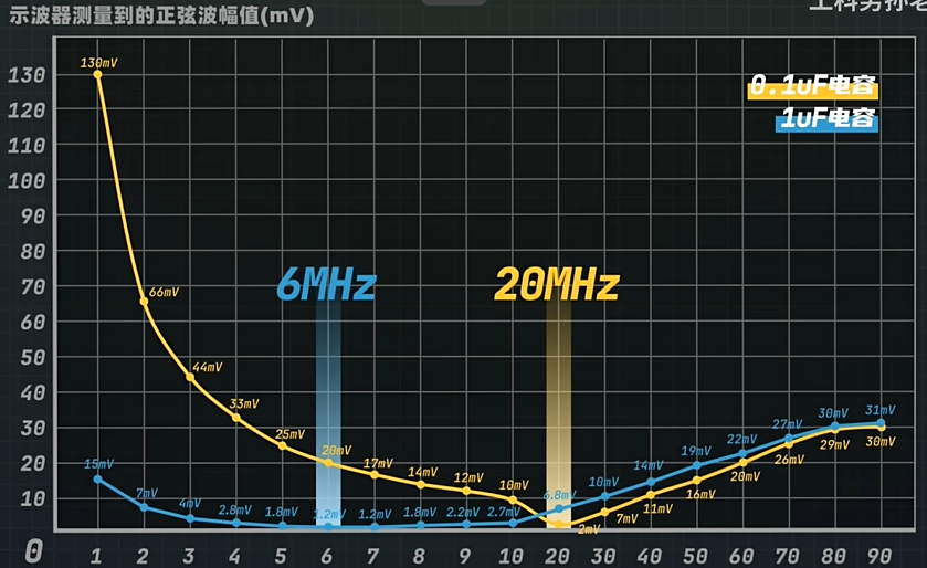 可见 0.1uf 电容在 6 MHz 正弦波输入中,获得最低的 1.2mV 滤波峰值。