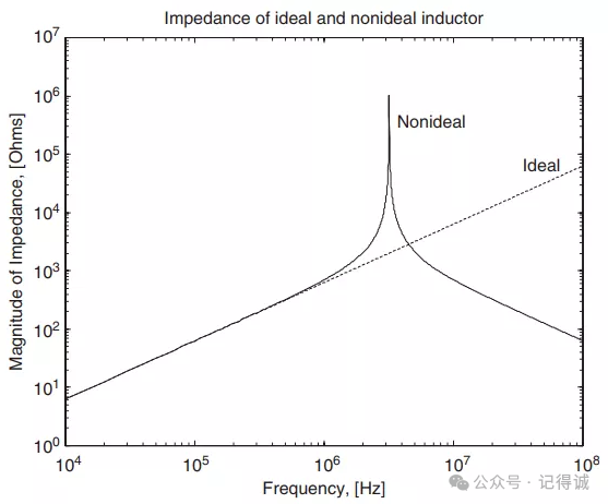 等效电感的阻抗呈一个倒 V 型,正好和电容相反,倒 V 的最高点称为电感的自谐振点。