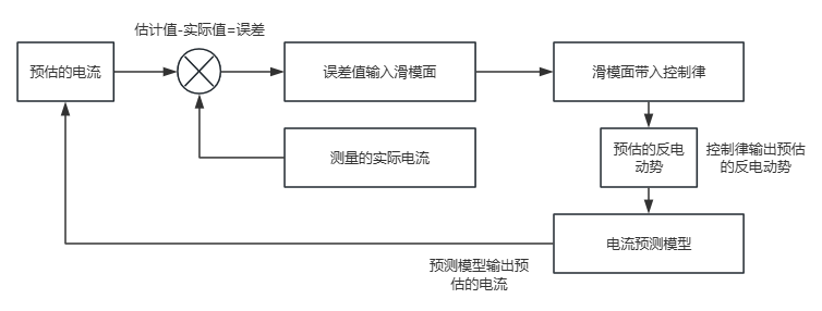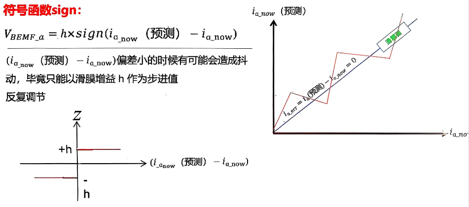 反电动势的滑模观测器核心思想是,根据电流和预估电流的误差预估一个反电动势 ,然后带入电流微分公式,得到预估电流。循环这个过程,我们便得到了 α、β 轴的反电动势。