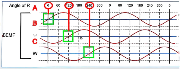 由于电机三相角度相差为 120° ,A 相的反电动势,相位差为0°;B 相则是120°;C 相是240°