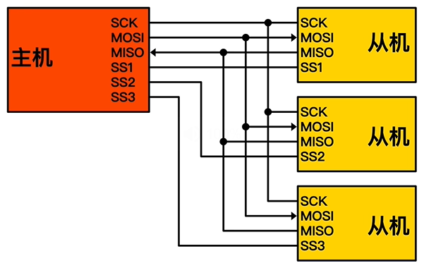 - 没有寻址机制,只能靠设备片选 (chip select) 选择不同从设备