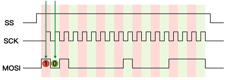 当选中这个设备后,SS 片选即拉高,之后 SCK 时钟线开始工作,在 SCK 每个上升沿时刻,如果 MOSI 为高电平,则为 1,为 低电平则为 0。