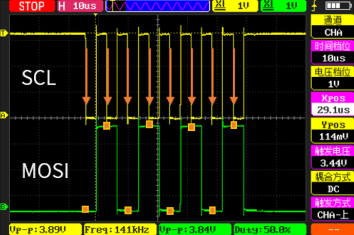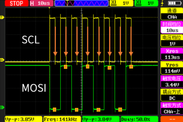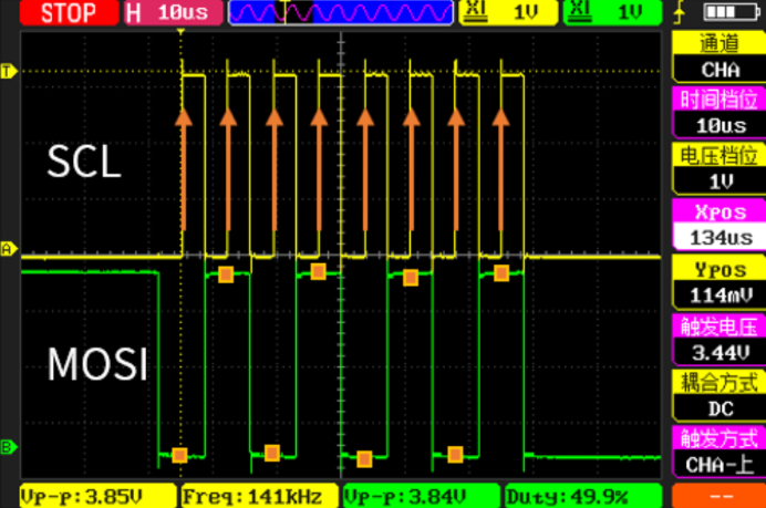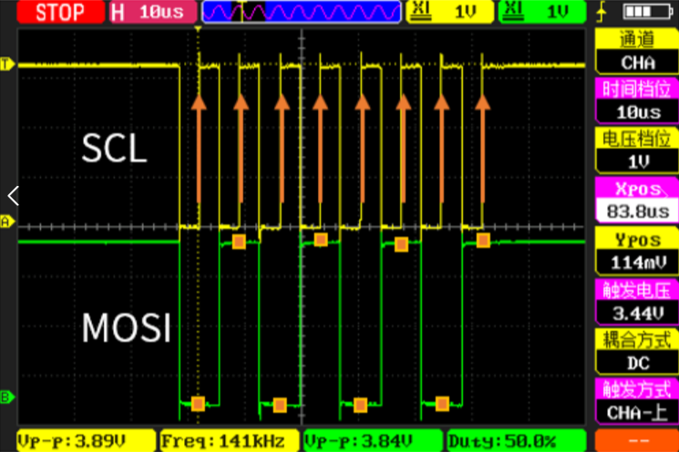 可见 SCL 空闲状态是低电平,MOSI 在第一个边沿传输。