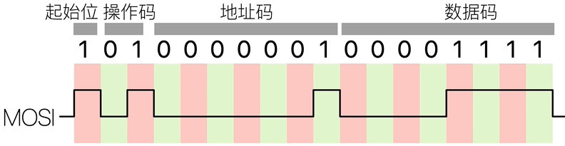 如果我们要向 000 0001 地址写入 0000 1111,这样我们的 MOSI 的波形是: