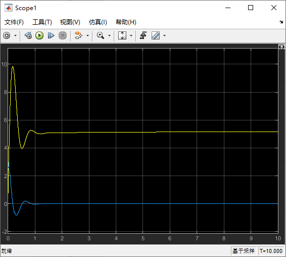 我们 d 轴的电流目标值为 5,其中黄线是 PI 输出值,蓝线是目标减去反馈的误差值。