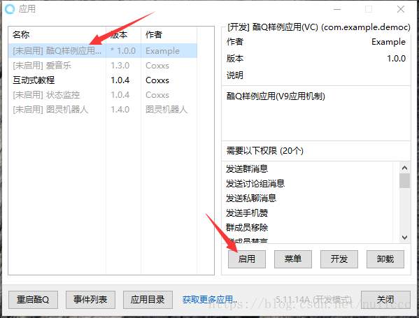 点击重启酷Q即可开启,然后启动酷Q样例应用(VC),因为我们没有修改包名,这是默认的。
