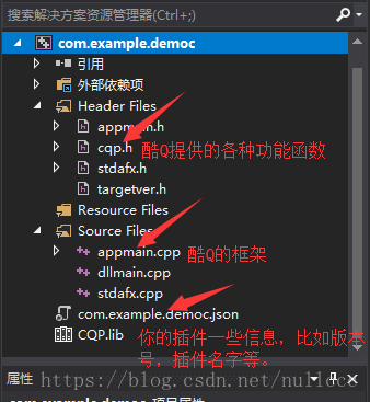 之后注意一下项目目录,似乎很多,我们只需要关注“appmain.cpp”,“cqp.h”,“com.example.democ.json”三个即可,其他无需理会,我们根本不用改他们。