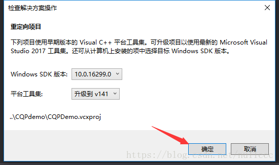 打开后提示升级工具集,因为他使用的是vs2010(v100)的生成工具。我们vs里并没没有,点击确定升级一下即可。