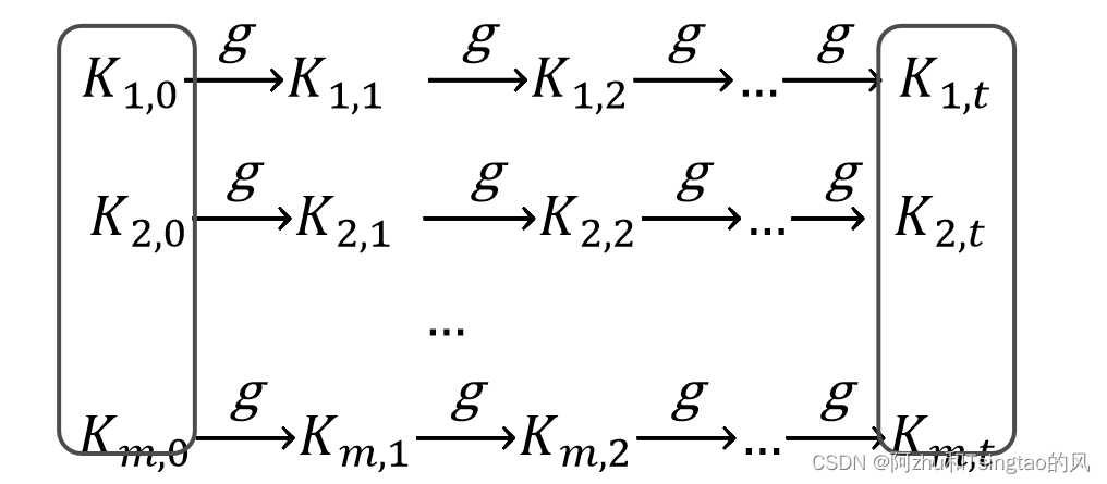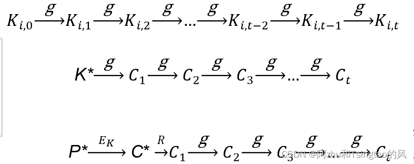 那么问题来了,如果st次比较都没有一样的怎么办?对C1继续做手脚!把C1当作K求得C2,继续和尾列比,如果此时相等,则说明真正的K进行了两次g函数才得到了结果,那么让我们来看K链,发现经过两次g函数得到了尾列,故可能正确的密钥就变成了