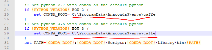 前面中已经确定了python3.5环境的安装路径为C:\ProgramData\Anaconda3\envs\caffe,故在文件中需要修改为:
