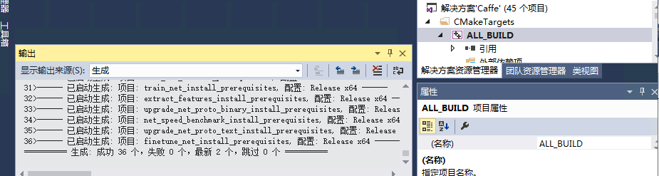 vs2015打开\caffe-windows\scripts\build文件夹下的Caffe.sln文件,分别设置Debug和Release编译ALL_BUILD成功后,注意都是x64。时间可能比较久,一般不会报错。