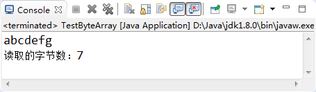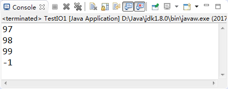 | 1 2 3 4 5 6 7 8 9 10 11 12 13 14 15 16 17 18 19 20 21 22 | import java.io.*; public class TestIO1 { public static void main(String[] args) { try { //创建输入流 FileInputStream fis = new FileInputStream("d:/a.txt"); // 文件内容是:abc //一个字节一个字节的读取数据 int s1 = fis.read(); // 打印输入字符a对应的ascii码值97 int s2 = fis.read(); // 打印输入字符b对应的ascii码值98 int s3 = fis.read(); // 打印输入字符c 对应的ascii码值99 int s4 = fis.read(); // 由于文件内容已经读取完毕,返回-1 System.out.println(s1); System.out.println(s2); System.out.println(s3); System.out.println(s4); // 流对象使用完,必须关闭!不然,总占用系统资源,最终会造成系统崩溃! fis.close(); } catch (Exception e) { e.printStackTrace(); } } } |