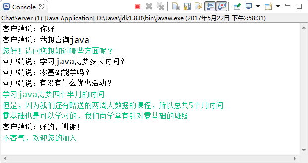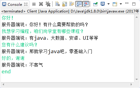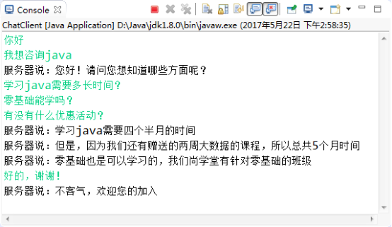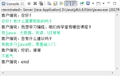 但是,上面这个程序,必须按照安排好的顺序,服务器和客户端一问一答!不够灵活!!可以使用多线程实现更加灵活的双向通讯!!