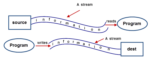 对于输入流而言,数据源就像水箱,流(stream)就像水管中流动着的水流,程序就是我们最终的用户。我们通过流(A Stream)将数据源(Source)中的数据(information)输送到程序(Program)中。