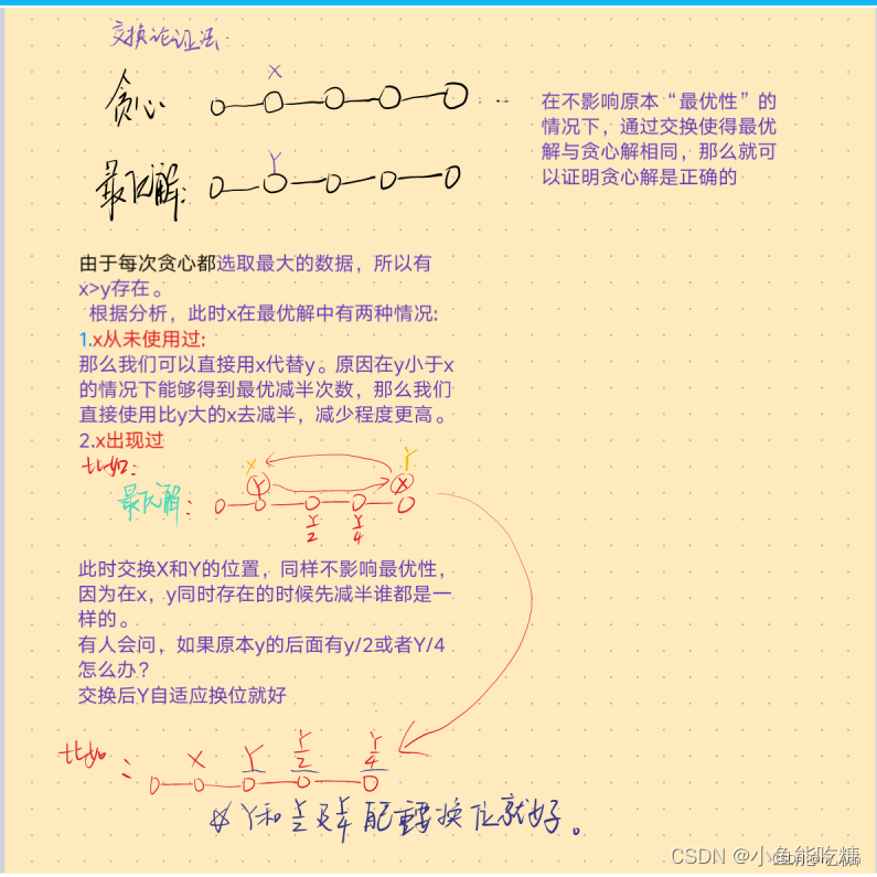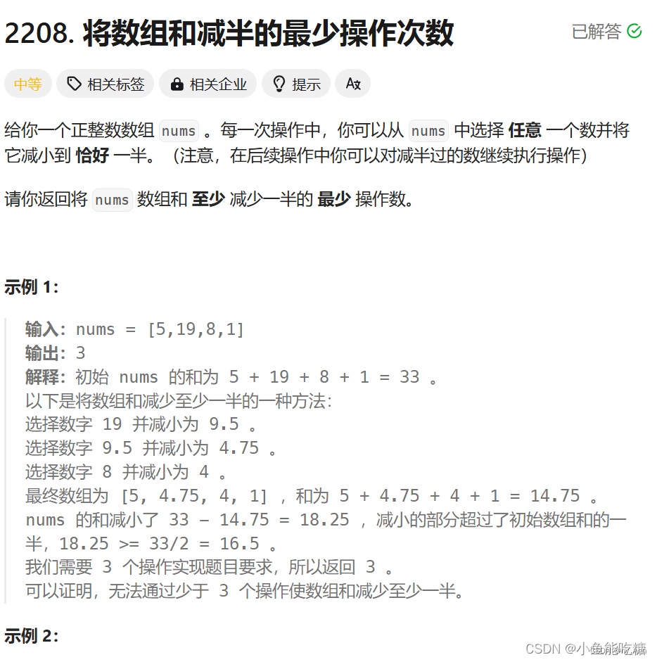 首先通过经验分析,要用最少的减半次数,使得数组总和减少至一半以上,那么第一反应就是每次都挑数组中最大的数据去减半,这样可以是每次数组总和值减少程度最大化。