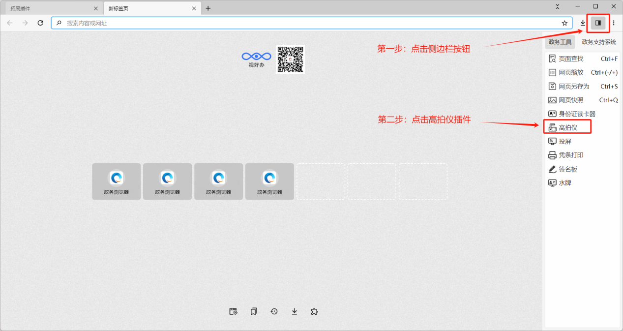 (1)进入政务浏览器首页,点击侧边栏按钮,点击高拍仪插件,点击【拍照】,可以保存图片或合并PDF到指定文件夹。拍照完成,点击【签名】,辅屏会弹出签名板,需要群众签名确认。如下图所示: