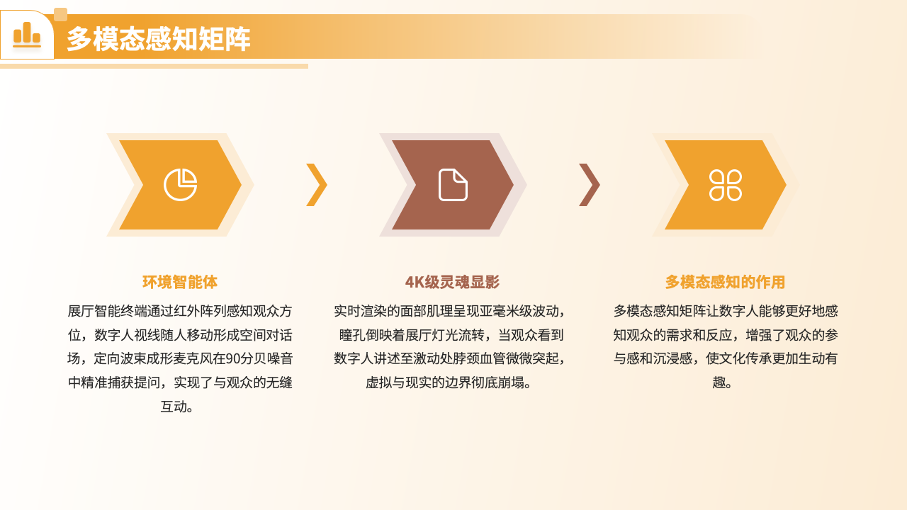 - 环境智能体:展厅智能终端通过红外阵列感知观众方位,数字人视线随人移动形成空间对话场。定向波束成形麦克风在90分贝噪音中精准捕获提问,如同在暴雨中听见蝴蝶振翅。