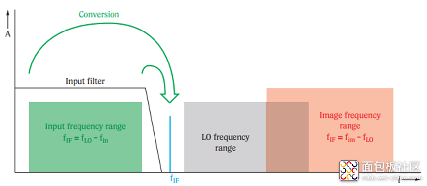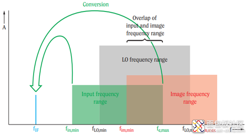 同时合理的中频选择是非常重要的,如图3所示,输入频率范围和镜像频率范围转换到低的中频(IF),如果输入信号频率大于两倍中频信号(IF),那么就会出现混叠,频谱上就分不清IF信号是输入变频而来还是镜像变频而来。因此需要前端增加带通滤波器(BPF),必须采用合适的截止频率和足够的衰减来抑制镜像的干扰。但是对于9KHz~3GHz的宽输入范围,带通滤波器(BPF)很难实现,并且复杂(因为信号和镜像有重叠)。所以为解决这个问题,可以考虑使用高中频(IF)。如图4所示,高中频实现。