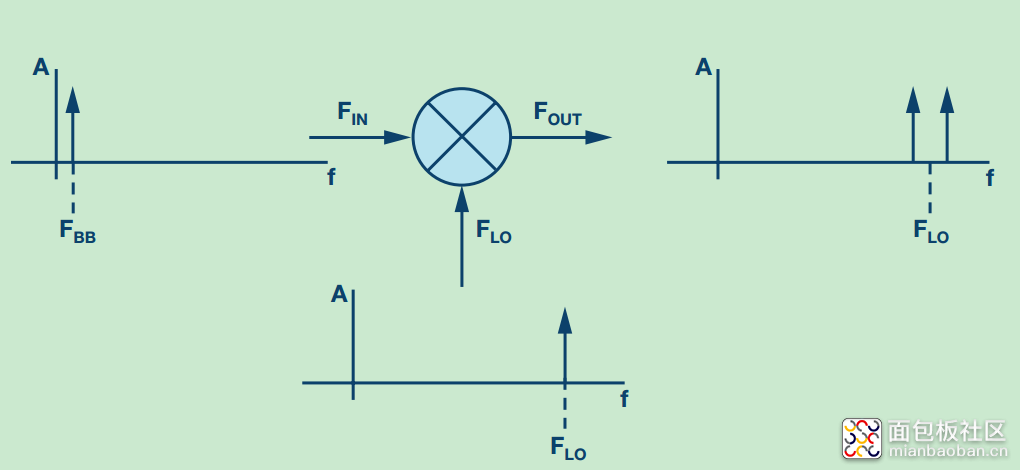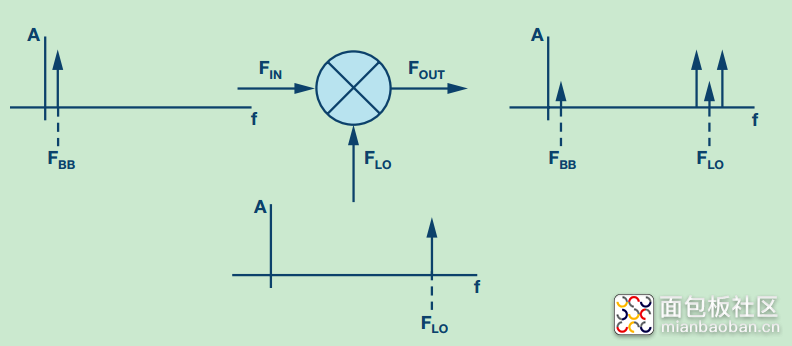从数学的表达式中可以看出,在输入信号和本振信号为理想信号时,对于输出信号Fout只有FIN + FLO以及FIN – FLO两个信号,但是实际应用中这些信号都是非理想的,比如输入和本振信号上有直流的偏差,即记为Cb和Clo,这些在信号在频谱上的贡献,如数学表达式所示,会产生一个输入信号的泄露、本振信号的泄露和一个零频的泄露。所以LO泄露信号路径上表达为直流的偏移,在对于复数混频构架为I或Q信号路径中表现为增大的直流失调。其原因是LO直接耦合至射频信号路径中,并被以相干方式下变频至输出。结果产生混频器积,表现为直流失调,加入信号链里存在的任何残余直流失调中。