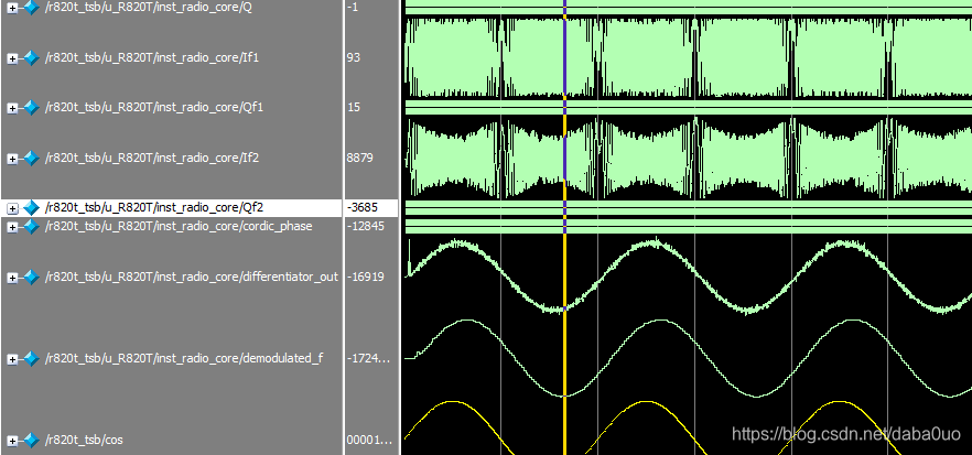 将Matlab调制后波形输出到FPGA仿真模型中,使用modelsim仿真波形,经过1bit采样、正交解调和3级CIC滤波后的波形总是杂乱无章,反复修改参数,关键在于CIC滤波抽取间隔值不能太大,目前大约在5~10之间。