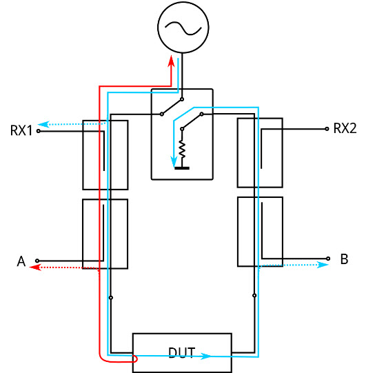 源通过开关,分别作为端口1或者端口2的输入。通过定向耦合器分离出入射信号和反射信号,即分别测试出bn和an。