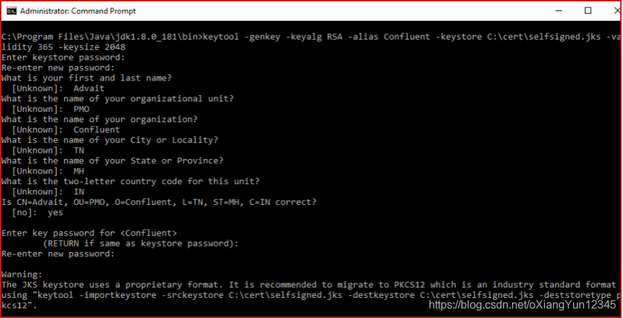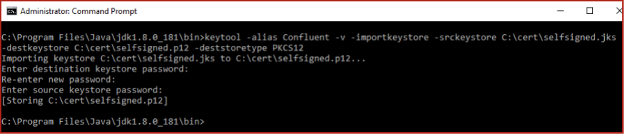 Ex. keytool -genkey -keyalg RSA -alias Confluent -keystore C:\cert\selfsigned.jks -validity 365 -keysize 2048.