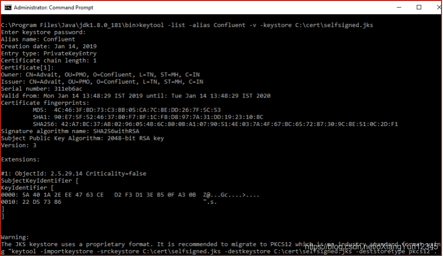 keytool -list -alias <aliasname> -v -keystore C:\cert\selfsigned.jks