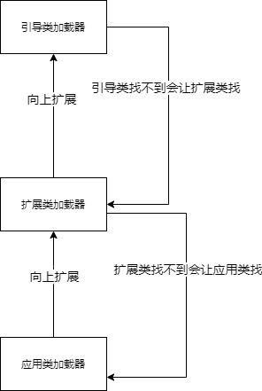 当应用类加载器收到请求要加载类进内存的时候,应用类加载器会向上汇报,到达扩展类加载器,扩展类加载器会再次上报,到达引导类扩展器,引导类扩展器如果发现需要加载的类自己加载不了,会叫扩展类加载,扩展类发现也加载不了,会让应用类加载。