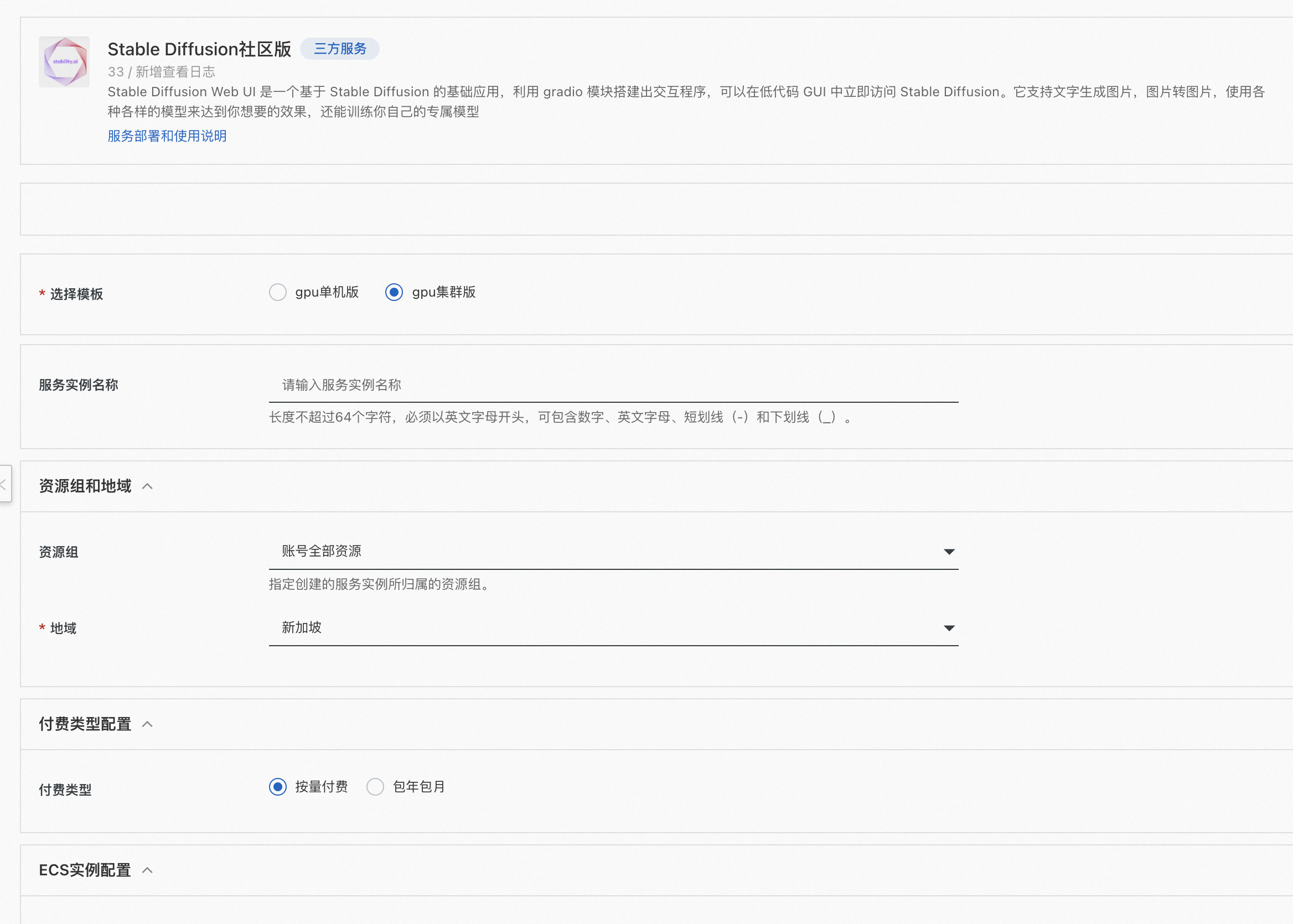 - 登录阿里云计算巢控制台,进入Stable Diffusion服务创建界面,根据界面提示,模版选择gpu集群版,填写相关参数(软件登录名及登录密码很重要,后面访问WebUI需要用到),填写完成点击确认订单。推荐选择按量付费方式,使用完将实例释放掉或选择节省停机模式进行关机(会在下文介绍)以节省成本。