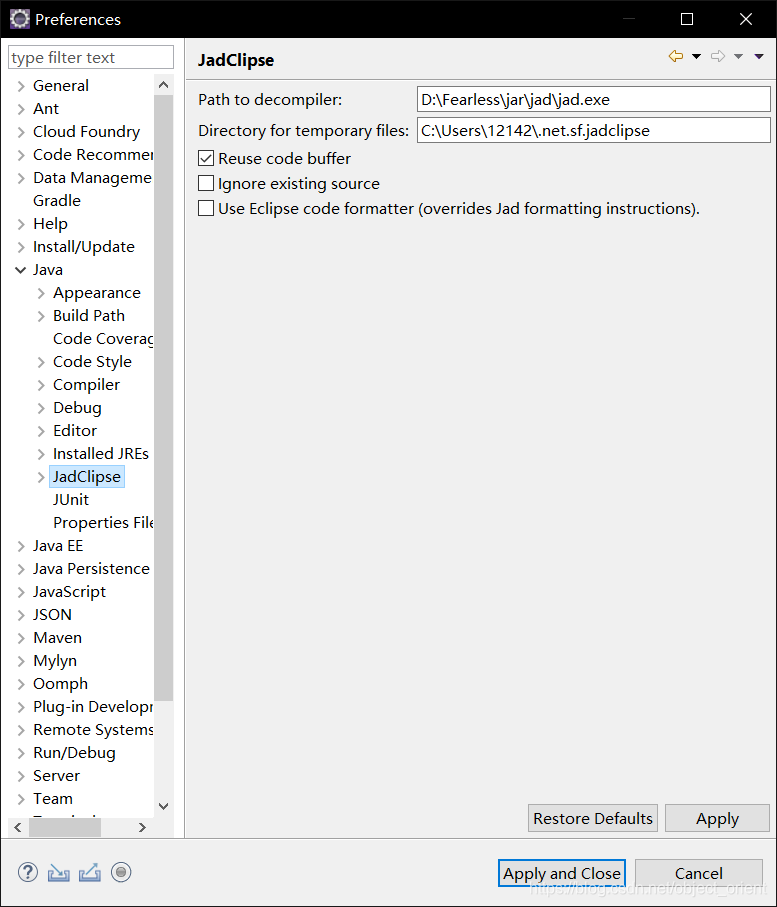 6、重启eclipse,找到Eclipse->Window->Preferences->Java->JadClipse