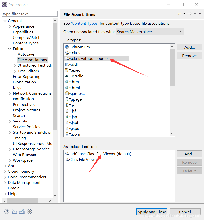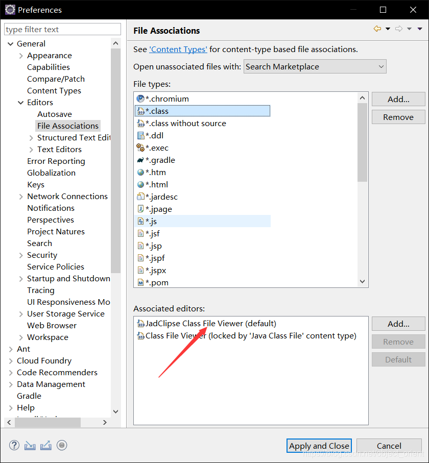 7、找到Eclipse->Window->Preferences->Geceral->Editors->File Associations,选择*.class,