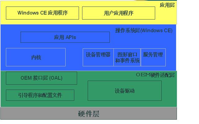 基于Windows CE的嵌入式系统采用四层体系结构,具有层次性强、可移植性好、组件可剪裁、强调编程接口和支持上层应用等特点。系统从下而上可分为四层:硬件层,OEM 硬件适配层,操作系统服务层,应用层。具体的系统架构可以用下图来表示: