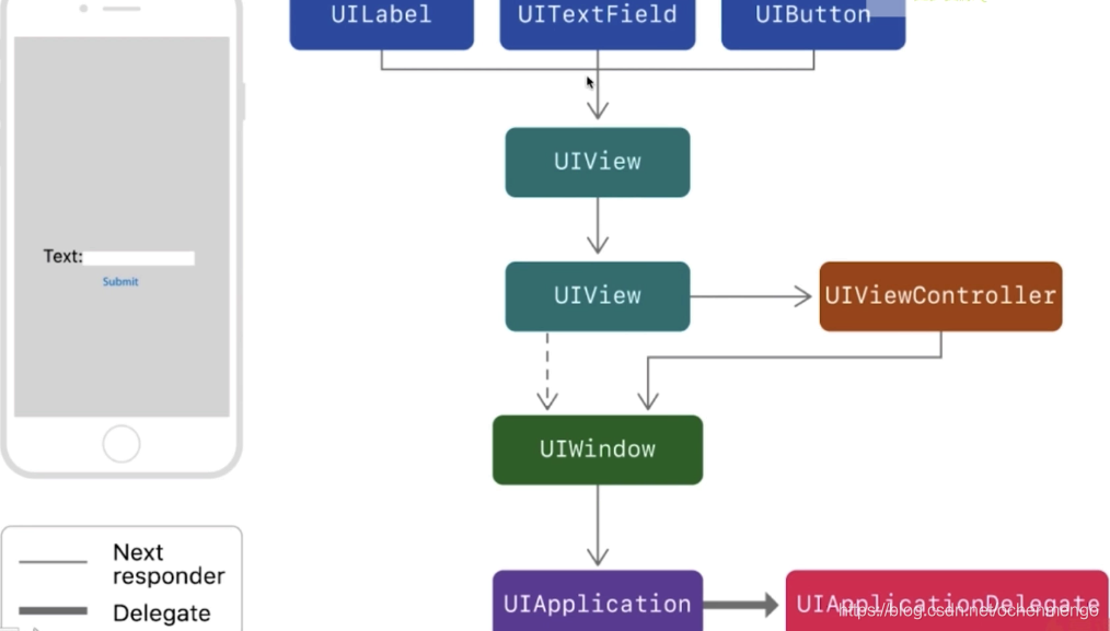 ①:UIView为其提供内容,以及负责处理触摸等事件,参与响应链