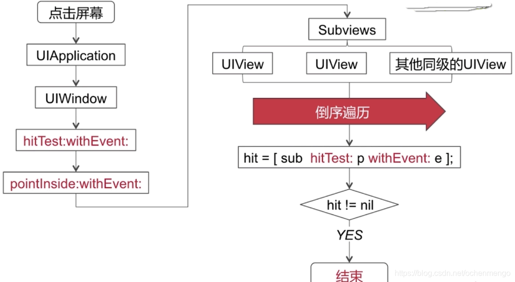 (2)UIWindow调用hitTest返回响应视图,先通过pointInside:判断是否在UIWindow范围内,如果在的话会通过倒序的方式遍历UIWIndow的子视图找出响应视图,最后添加的子视图会最先调用hitTest方法,递归调用hitTest返回找到的视图。