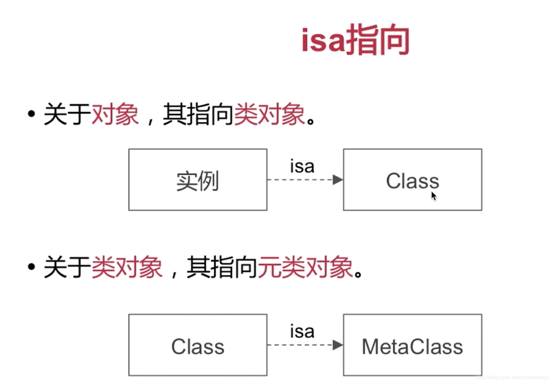 - objc_object当中有一个成员变量叫isa_t,那么这个isa_t指针就指向一个objc_class类型的类对象(或者说元类对象)
