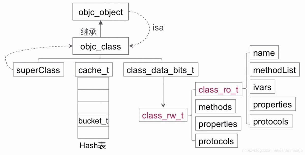 class_data_bits_t:实际上是对class_rw_t的数据结构的封装 class_rw_t中包含了(class_ro_t 类相关的只读信息、protocols 类分类中的协议、properties 类分类中的属性、methods 类分类中的方法)