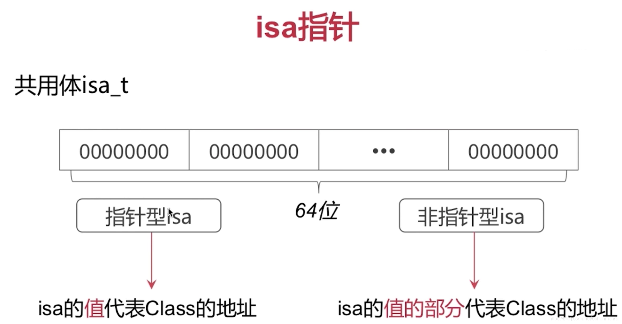 - 指针型isa: 64位的0或者1的整体内容代表所指向的Class的地址,也就是可以通过isa的内容来获得类对象的地址