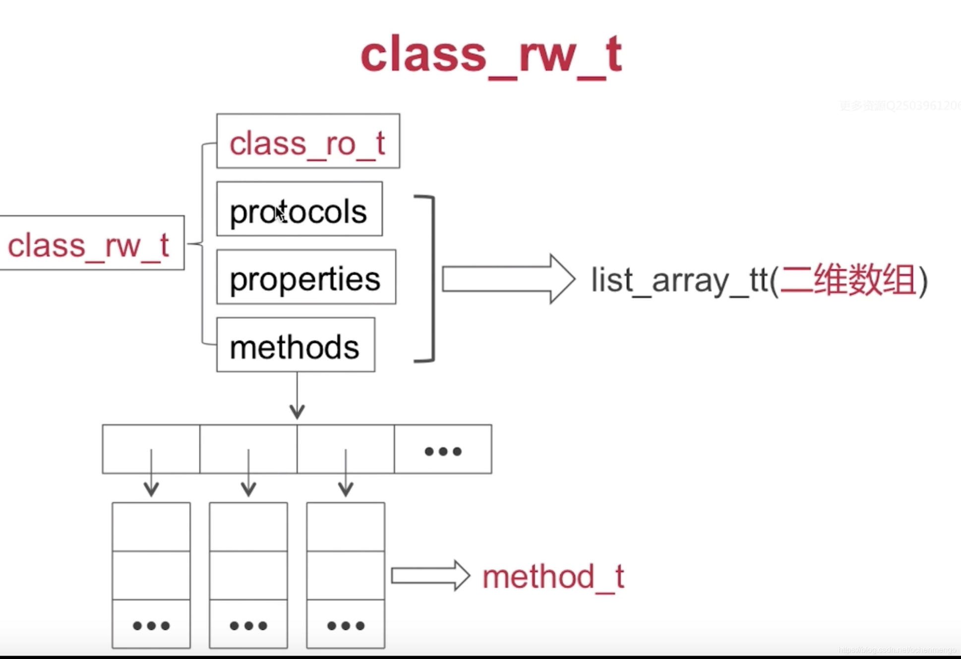 - class_rw_t代表了类相关的读写信息,例如给类添加的分类的一些方法,属性以及协议等,同时它也对class_ro_t的封装,我们可以随时创建分类,为类增加属性或者方法