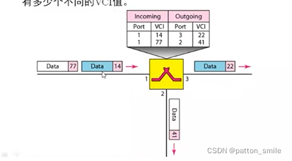 2)虚电路网络:需要建立连接,分组后沿着同一虚电路传输;路由表,端口号、VCI值;分组有VCI标识