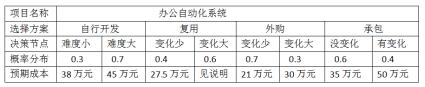 66、某机构拟进行办公自动化系统的建设,有四种方式可以选择:①企业自行从头开发;②复用已有的构件;③外购现成的软件产品;④承包给专业公司开发。针对这几种方式,项目经理提供了如下表所示的决策树。其中在复用的情况下,如果变化大则存在两种可能,简单构造的概率为0.2,成本约31万元;复杂构造的概率为0.8,成本约49万元。据此表,管理者选择建设方式的最佳决策是 ( ) 。