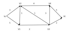 对于路径Vs-V2-V4-Vt,其最小流量为3(由V2到V4的流量决定)。