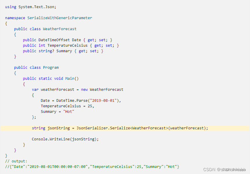 string jsonString = JsonSerializer.Serialize(weatherForecast, options);