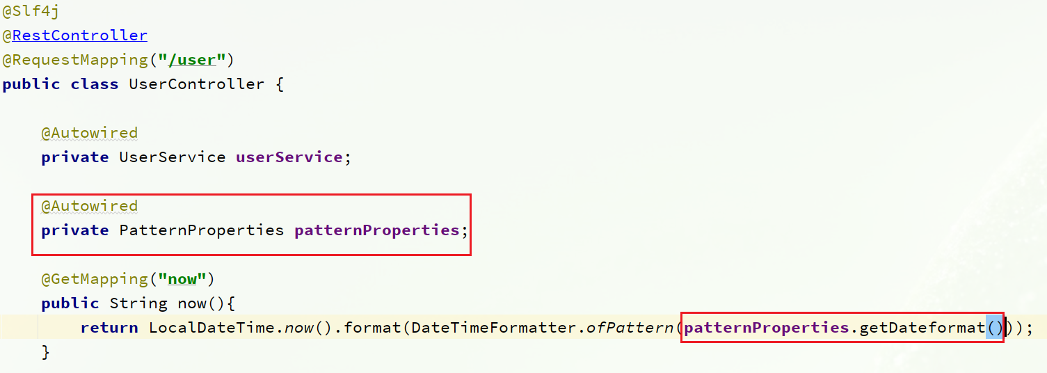 在user-service服务中,添加一个类,读取patterrn.dateformat属性: