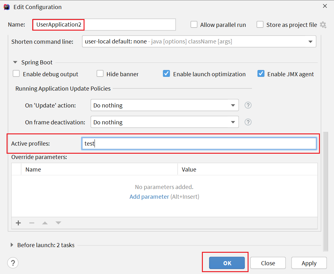 这样,UserApplication(8081)使用的profile是dev,UserApplication2(8082)使用的profile是test。