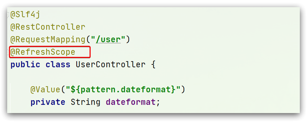 在user-service中的UserController中添加业务逻辑,读取pattern.dateformat配置: