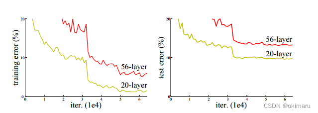 图1所示。CIFAR-10在20层和56层“普通”网络上的训练误差(左)和测试误差(右)。网络越深,训练误差越大,测试误差也越大。ImageNet上的类似现象如图4所示。