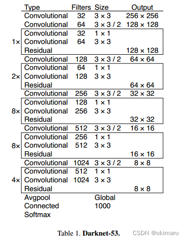 新网络是YOLOv2、Darknet-19中使用的网络和那些新奇的残余网络之间的混合方法。我们的网络使用连续的3 × 3和1 × 1卷积层,但现在也有一些快捷连接,并且明显更大。它有53个卷积层,所以我们叫它Darknet-53。