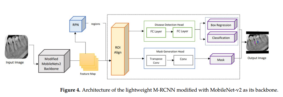 为此,我们提出了一种用于根尖周疾病检测的轻量级Mask-RCNN模型。该模型分为两部分构建:轻量级的改进MobileNet-v2骨干网和基于区域的网络(RPN),用于小数据集的根尖周疾病定位。为了测量所提出模型的有效性,轻量级的Mask-RCNN在包含五种不同类型根尖周围病变图像的自定义注释数据集上进行评估。结果表明,该模型可以检测和定位根尖周围病变,总体精度为94%,平均平均精度为85%,平均感染率为71.0%。