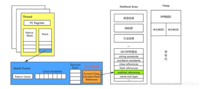 - 不同线程中所包含的栈帧是不允许相互引用的,即不可能一个栈帧中,引用另外一个线程的栈帧