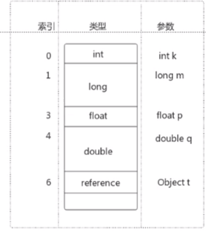 - 如果当前帧是由构造方法或者实例方法创建的,那么该对象引用this将会存放在index为0的slot处,其余的参数按照参数表顺序排列